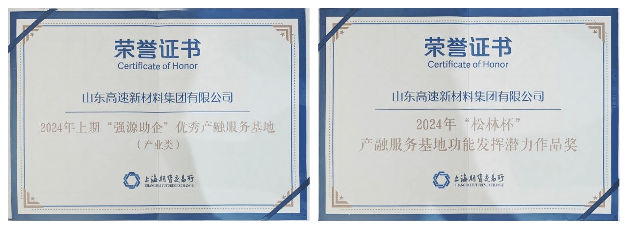 近日,上期所举办2024年“松林杯”产融服务基地功能发挥作品展映暨产业服务工作座谈会。会上,对在产融服务方面表现突出的单位进行了表彰。凭借卓越的市场表现和深厚的专业实力,荣获2024年上期“强源助企”优秀产融服务基地(产业类)称号,以及“松林杯”产融服务基地功能发挥潜力作品奖。
