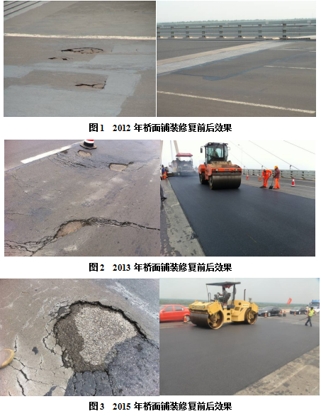 济南黄河三桥是青银高速济南绕城大北环段跨越黄河的一座特大桥,该桥主桥规模在当时同类桥梁中位居世界第二、亚洲第一。原桥面采用环氧沥青混凝土铺装而成,2008年年底通车。2010年东南端桥头桥面铺装出现开裂,泛出锈迹;2011年桥面开裂位置松散和脱落,桥面板裸露,采用进口修复胶进行修复;2012年,修复位置旁又出现大面积脱落和锈蚀,其他部位相继产生了推移、开裂、脱落等损坏。2012年起至今,逐年应用A1型、B型新型高黏沥青进行养护维修,应用至今未产生任何病害,工程成本仅约为原铺装材料的1/3。