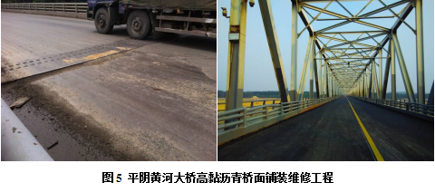 平阴黄河大桥为钢桁架结构桥,是105国道上的重要桥梁,全长963.52m。维修前主要病害为开裂及松散,桥头及伸缩缝部位铺装层脱落严重,桥面板大面积裸露。2014年采用A1型、B型新型高黏沥青进行全桥桥面铺装层重铺,使用至今未发生任何病害。